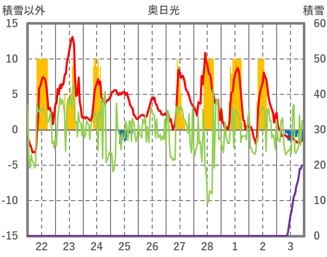 | 日 | 時 | 気温 | 降水 | 風向/風速 | 日照 | 積雪 | 降雪 |