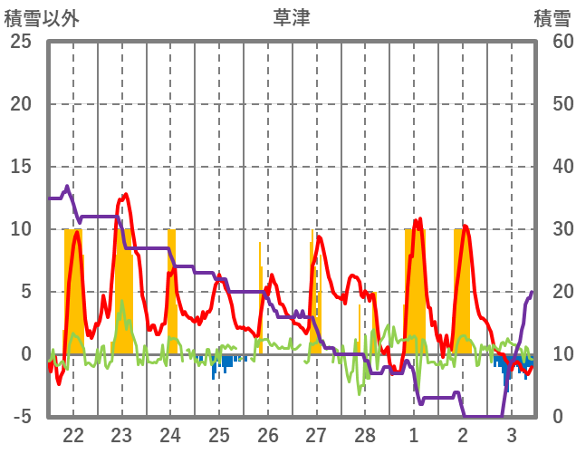 | 日 | 時 | 気温 | 降水 | 風向/風速 | 日照 | 積雪 | 降雪 |