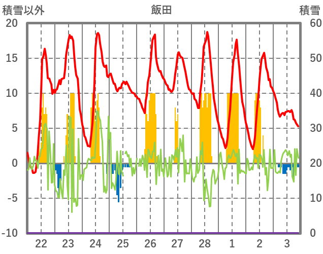 | 日 | 時 | 気温 | 降水 | 風向/風速 | 日照 | 積雪 | 降雪 |