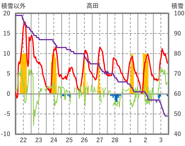 | 日 | 時 | 気温 | 降水 | 風向/風速 | 日照 | 積雪 | 降雪 |