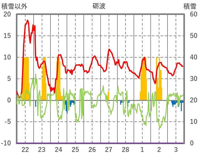 | 日 | 時 | 気温 | 降水 | 風向/風速 | 日照 | 積雪 | 降雪 |