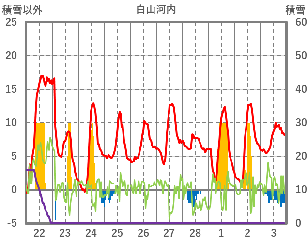 | 日 | 時 | 気温 | 降水 | 風向/風速 | 日照 | 積雪 | 降雪 |