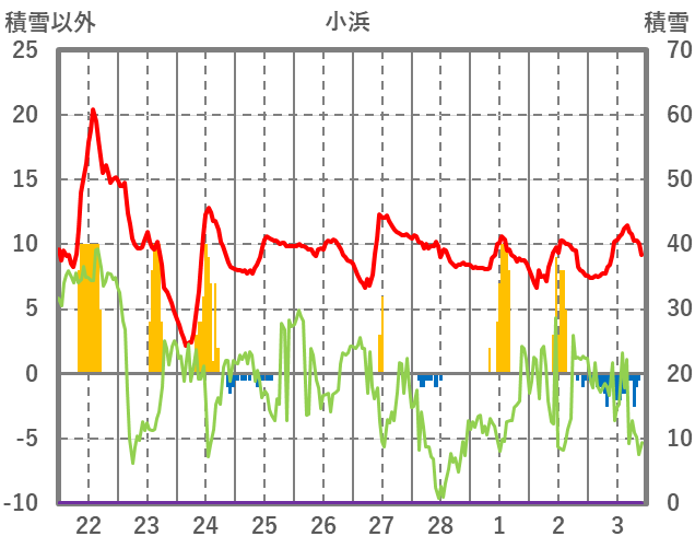 | 日 | 時 | 気温 | 降水 | 風向/風速 | 日照 | 積雪 | 降雪 |