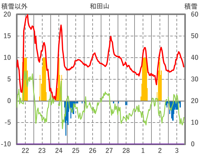| 日 | 時 | 気温 | 降水 | 風向/風速 | 日照 | 積雪 | 降雪 |