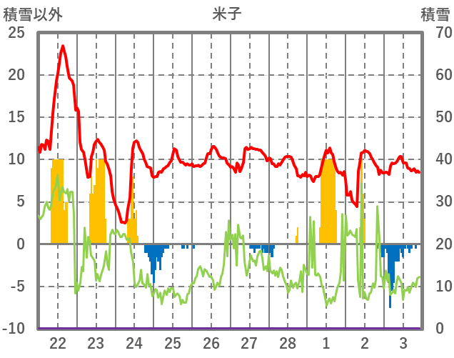 | 日 | 時 | 気温 | 降水 | 風向/風速 | 日照 | 積雪 | 降雪 |