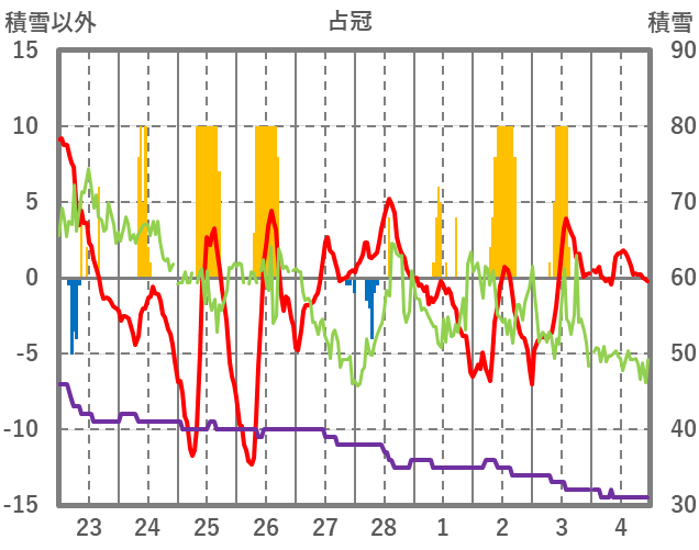 | 日 | 時 | 気温 | 降水 | 風向/風速 | 日照 | 積雪 | 降雪 |