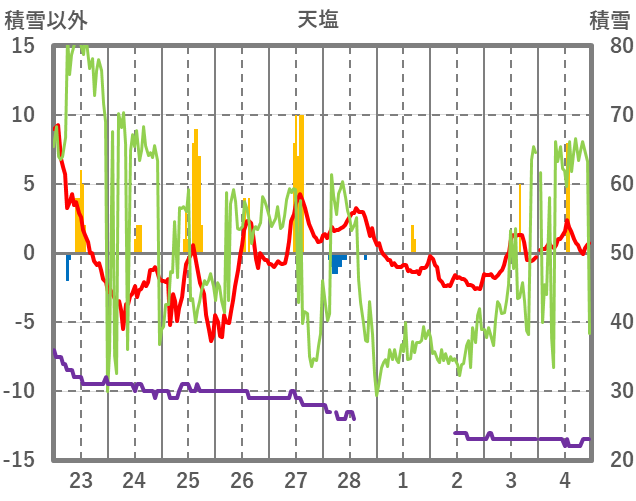 | 日 | 時 | 気温 | 降水 | 風向/風速 | 日照 | 積雪 | 降雪 |