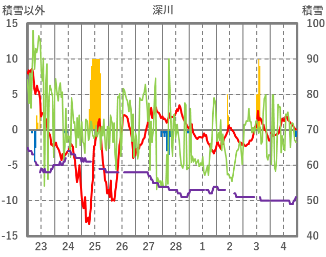 | 日 | 時 | 気温 | 降水 | 風向/風速 | 日照 | 積雪 | 降雪 |