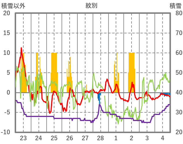 | 日 | 時 | 気温 | 降水 | 風向/風速 | 日照 | 積雪 | 降雪 |