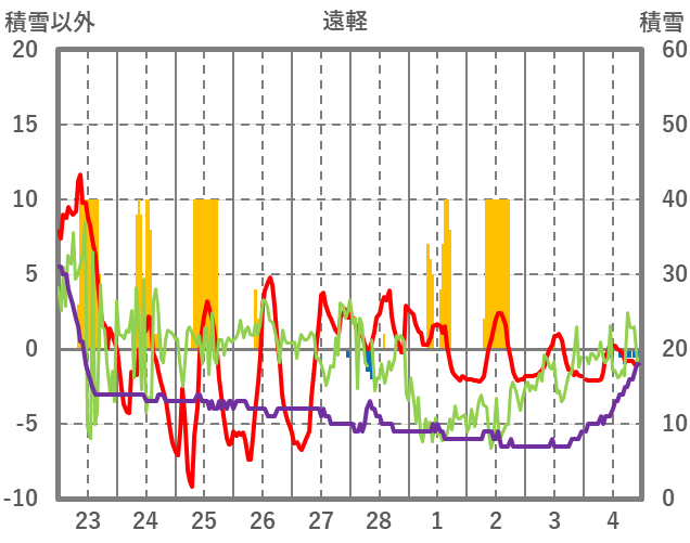 | 日 | 時 | 気温 | 降水 | 風向/風速 | 日照 | 積雪 | 降雪 |