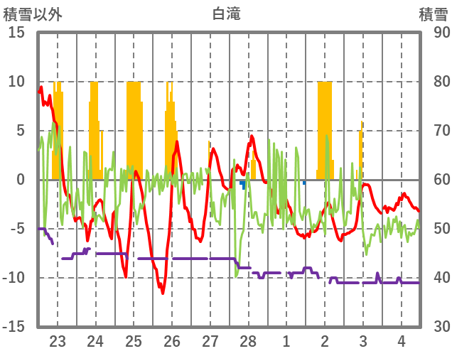 | 日 | 時 | 気温 | 降水 | 風向/風速 | 日照 | 積雪 | 降雪 |
