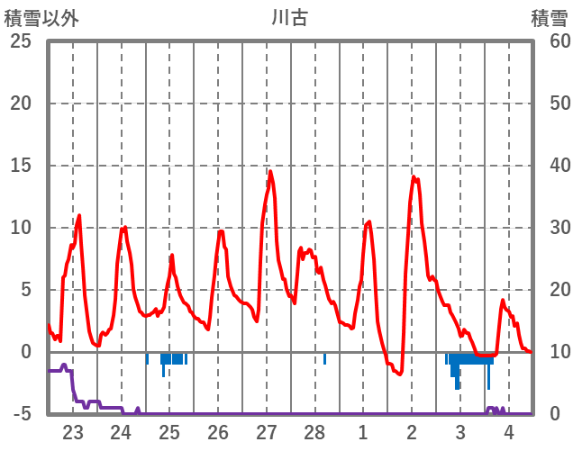 | 日 | 時 | 気温 | 降水 | 風向/風速 | 日照 | 積雪 | 降雪 |