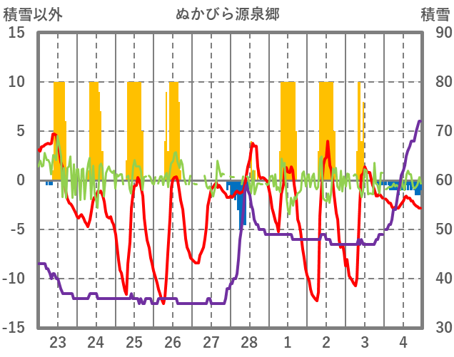 | 日 | 時 | 気温 | 降水 | 風向/風速 | 日照 | 積雪 | 降雪 |