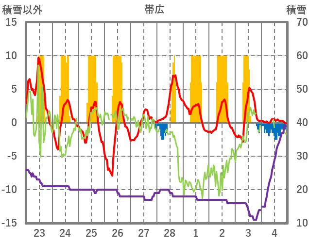 | 日 | 時 | 気温 | 降水 | 風向/風速 | 日照 | 積雪 | 降雪 |