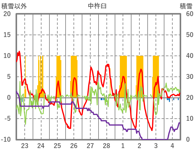 | 日 | 時 | 気温 | 降水 | 風向/風速 | 日照 | 積雪 | 降雪 |