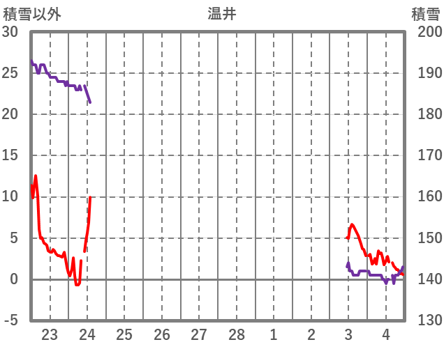 | 日 | 時 | 気温 | 降水 | 風向/風速 | 日照 | 積雪 | 降雪 |
