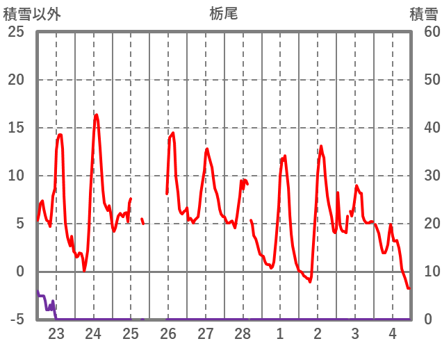 | 日 | 時 | 気温 | 降水 | 風向/風速 | 日照 | 積雪 | 降雪 |