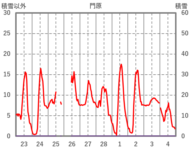 | 日 | 時 | 気温 | 降水 | 風向/風速 | 日照 | 積雪 | 降雪 |
