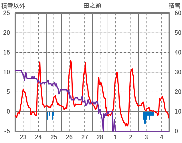 | 日 | 時 | 気温 | 降水 | 風向/風速 | 日照 | 積雪 | 降雪 |