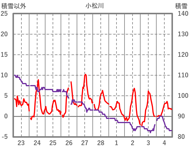 | 日 | 時 | 気温 | 降水 | 風向/風速 | 日照 | 積雪 | 降雪 |