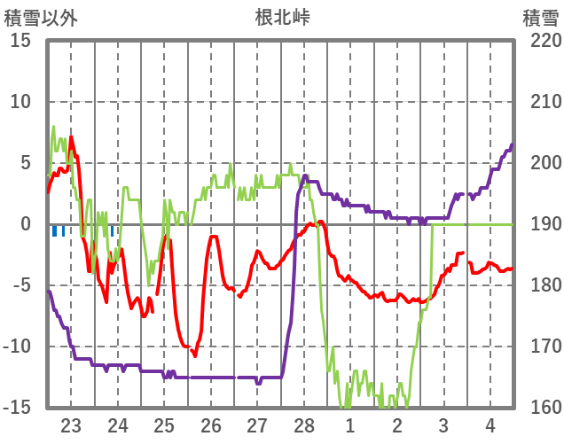 | 日 | 時 | 気温 | 降水 | 風向/風速 | 日照 | 積雪 | 降雪 |