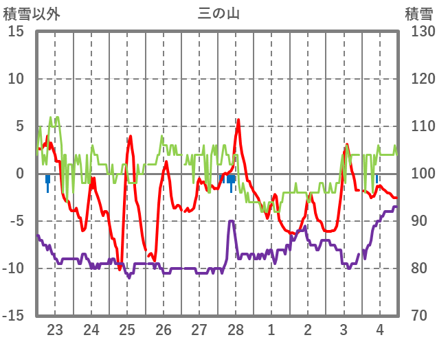 | 日 | 時 | 気温 | 降水 | 風向/風速 | 日照 | 積雪 | 降雪 |