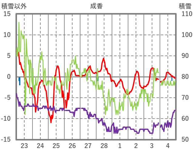 | 日 | 時 | 気温 | 降水 | 風向/風速 | 日照 | 積雪 | 降雪 |
