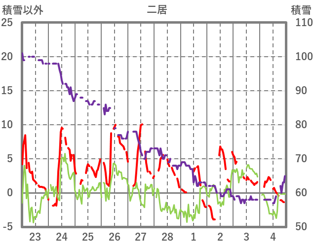 | 日 | 時 | 気温 | 降水 | 風向/風速 | 日照 | 積雪 | 降雪 |