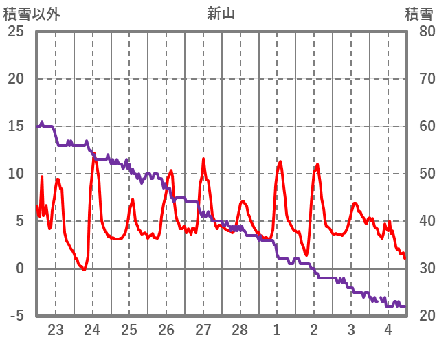 | 日 | 時 | 気温 | 降水 | 風向/風速 | 日照 | 積雪 | 降雪 |