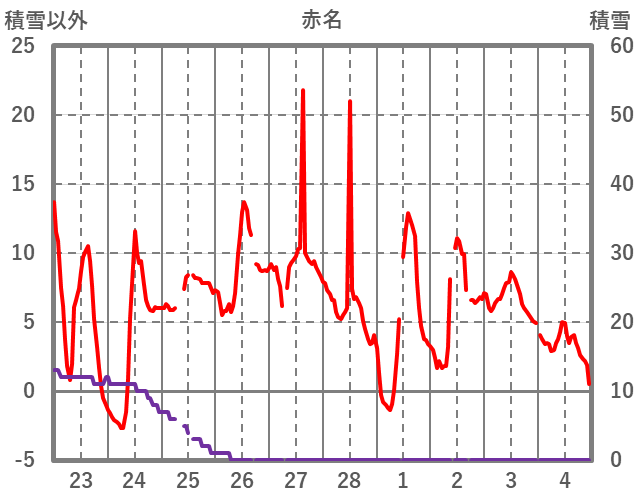 | 日 | 時 | 気温 | 降水 | 風向/風速 | 日照 | 積雪 | 降雪 |
