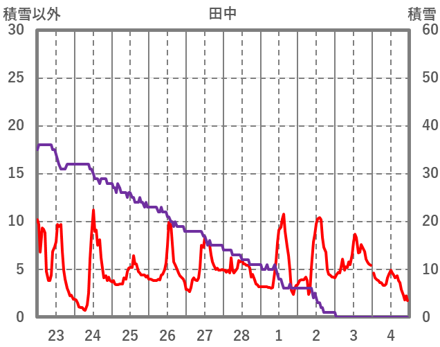 | 日 | 時 | 気温 | 降水 | 風向/風速 | 日照 | 積雪 | 降雪 |