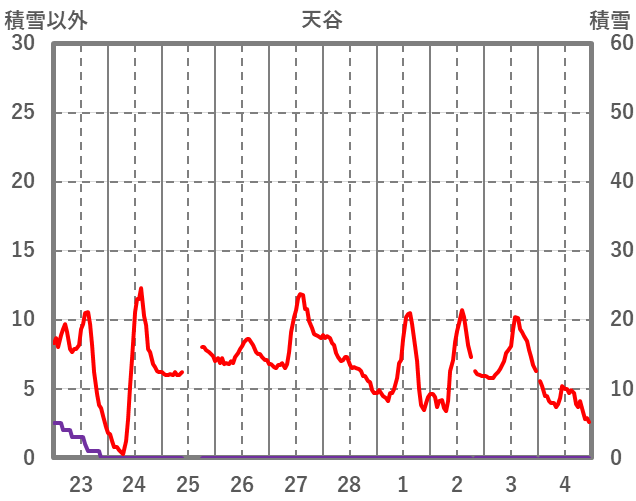 | 日 | 時 | 気温 | 降水 | 風向/風速 | 日照 | 積雪 | 降雪 |