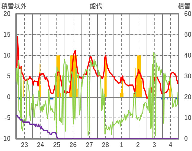 | 日 | 時 | 気温 | 降水 | 風向/風速 | 日照 | 積雪 | 降雪 |