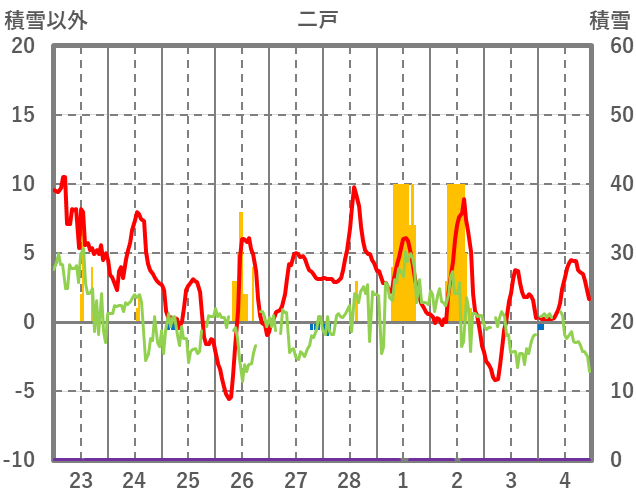 | 日 | 時 | 気温 | 降水 | 風向/風速 | 日照 | 積雪 | 降雪 |