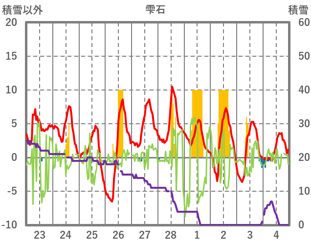 | 日 | 時 | 気温 | 降水 | 風向/風速 | 日照 | 積雪 | 降雪 |