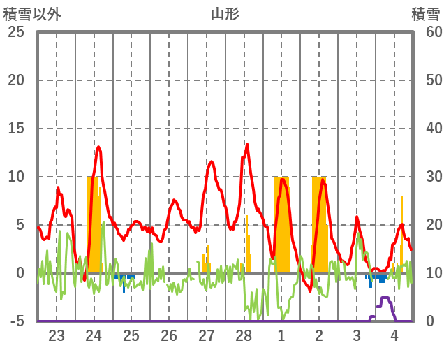 | 日 | 時 | 気温 | 降水 | 風向/風速 | 日照 | 積雪 | 降雪 |