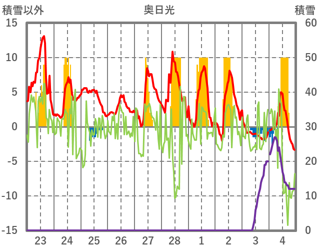 | 日 | 時 | 気温 | 降水 | 風向/風速 | 日照 | 積雪 | 降雪 |