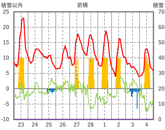 | 日 | 時 | 気温 | 降水 | 風向/風速 | 日照 | 積雪 | 降雪 |