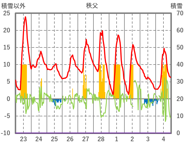 | 日 | 時 | 気温 | 降水 | 風向/風速 | 日照 | 積雪 | 降雪 |