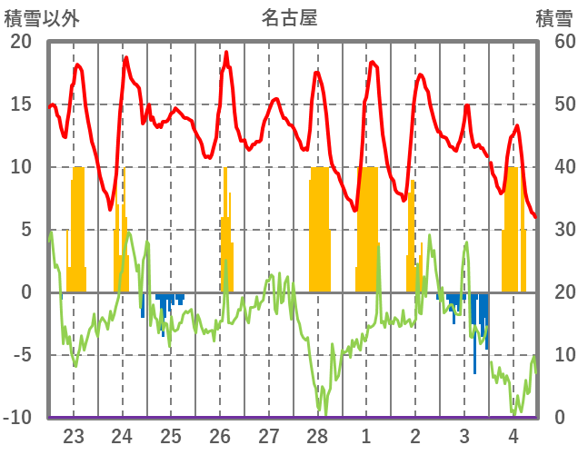 | 日 | 時 | 気温 | 降水 | 風向/風速 | 日照 | 積雪 | 降雪 |