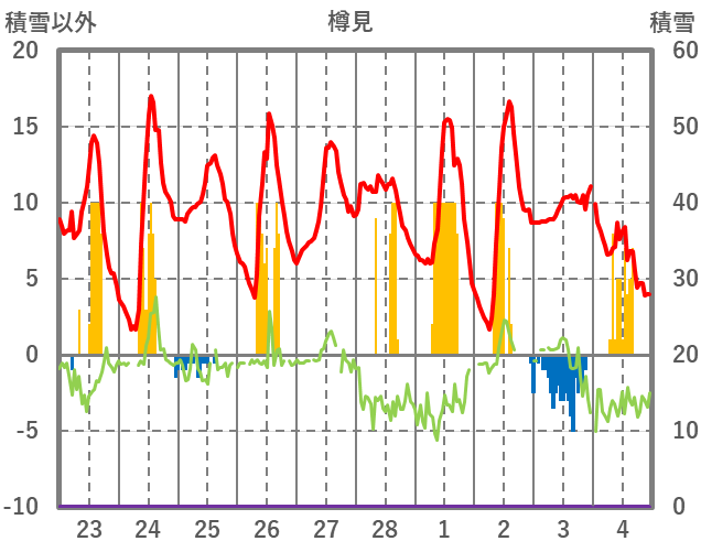 | 日 | 時 | 気温 | 降水 | 風向/風速 | 日照 | 積雪 | 降雪 |