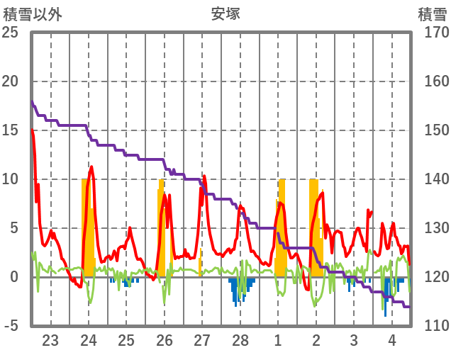 | 日 | 時 | 気温 | 降水 | 風向/風速 | 日照 | 積雪 | 降雪 |