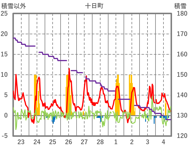 | 日 | 時 | 気温 | 降水 | 風向/風速 | 日照 | 積雪 | 降雪 |