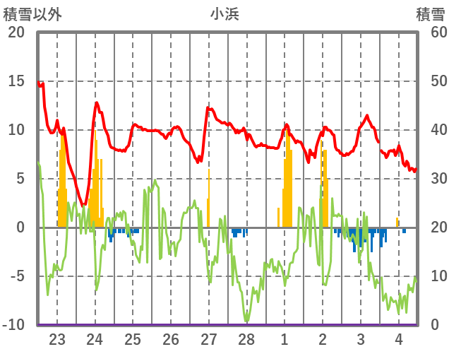 | 日 | 時 | 気温 | 降水 | 風向/風速 | 日照 | 積雪 | 降雪 |