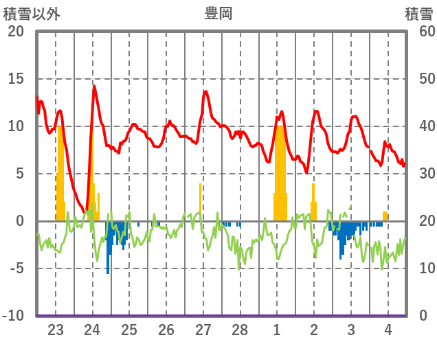 | 日 | 時 | 気温 | 降水 | 風向/風速 | 日照 | 積雪 | 降雪 |