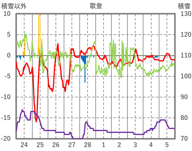 | 日 | 時 | 気温 | 降水 | 風向/風速 | 日照 | 積雪 | 降雪 |