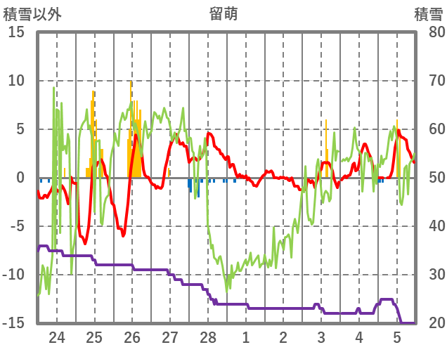 | 日 | 時 | 気温 | 降水 | 風向/風速 | 日照 | 積雪 | 降雪 |