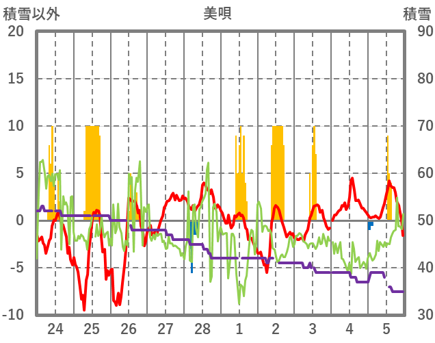 | 日 | 時 | 気温 | 降水 | 風向/風速 | 日照 | 積雪 | 降雪 |
