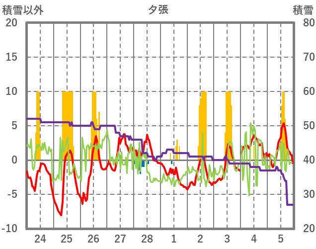 | 日 | 時 | 気温 | 降水 | 風向/風速 | 日照 | 積雪 | 降雪 |