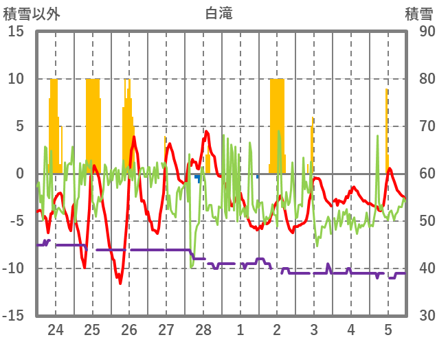 | 日 | 時 | 気温 | 降水 | 風向/風速 | 日照 | 積雪 | 降雪 |